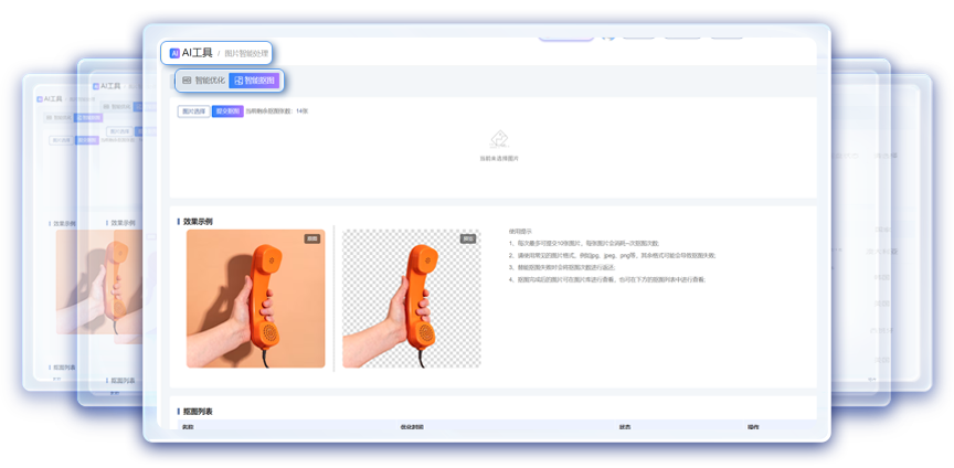 通过智能算法对图片的分辨率、清晰度、色彩饱和度、对比度等进行调整和优化,增强图片视觉效果;精准提取主体,去除背景干扰,满足实际应用场景中更换背景,提升图片的专业性和美观度的要求。