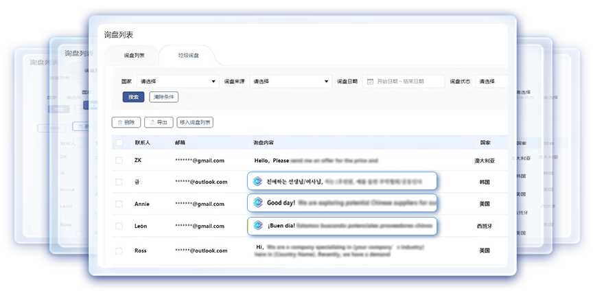 本功能基于人工智能的垃圾询盘过滤系统,通过自然语言处理技术实现精准识别。在收到询盘的瞬间开始智能识别,被标记的询盘可自动被筛选到垃圾询盘列表,有相应的筛选项和AI标识标记。可有效为外贸人减少垃圾询盘的干扰,专注跟进精准客户。
